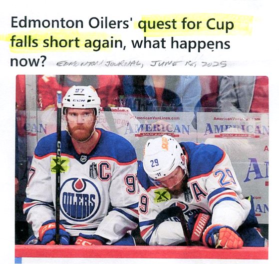 The next day, in the aftermath of the loss, I was reading hockey-talk and something in the above photo jumped out at me. It showed Connor McDavid and Leon Draisaitl reacting to the winning goal by the Panthers ending Oilers' run for the Stanley Cup. I zoomed in on the X-shaped logo on their shirts that I'd been wondering about all through the games. It looked slightly different from the star-shaped logo they usually wear, the controversial origin of which is explained below: