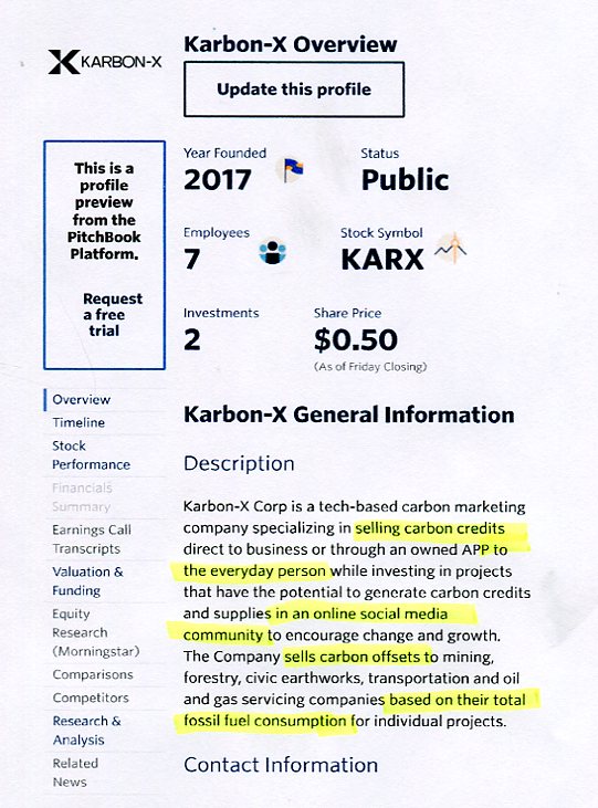Karbon-X Corp is a tech-based carbon marketing company specializing in selling carbon credits direct to business or through an owned APP to the everyday person while investing in projects that have the potential to generate carbon credits and supplies in an online social media comunity to encourage change and growth. The Company sells carbon offsets to mining, forestry, civic earthworks, transportation and oil and gas servicing companies based on their total fossil fuel consumption for individual projects.