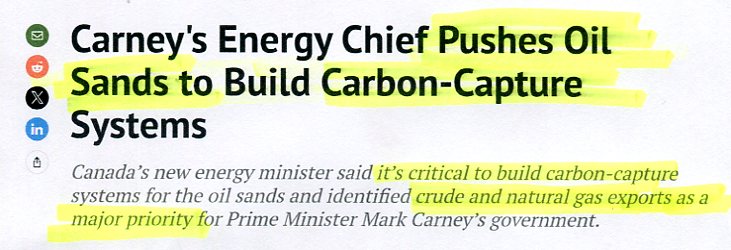 Did Carney embarass himself by touting "decarbonized oil" last week? One federal advisor thinks so. Canada's new PM parroted nonsenese after a meeting with premiers last week. "Decarbonized oil" is now apparently a thing. Prime Minister Mark Carney spoke glowingly about this mythical substance in the context of new bitumen pipelines after his meeting last week in Saskatoon with Canada's premiers. Alberta Premier Danielle Smith chimed in her support for carbon-free unicorn oil as part of a new "grand bargain" where Ottawa would facilitate another bitumen pipeline to tidewater [to red China] in exchange for the 6 highly profitable companies within the Pathways Alliance finally moving forward with their carbon capture and storage (CCS) project. To be clear, decarbonized oil is as absurd as talking about vitamin cigarettes or weight-loss ice cream. Bitumen and crude oil are sold to make transportation fuels that are burned in engines... These downstream emissions represent 80 percent of the carbon burden and are utterly unavoidable unless we somehow affix bags onto all the world's tailpipes.