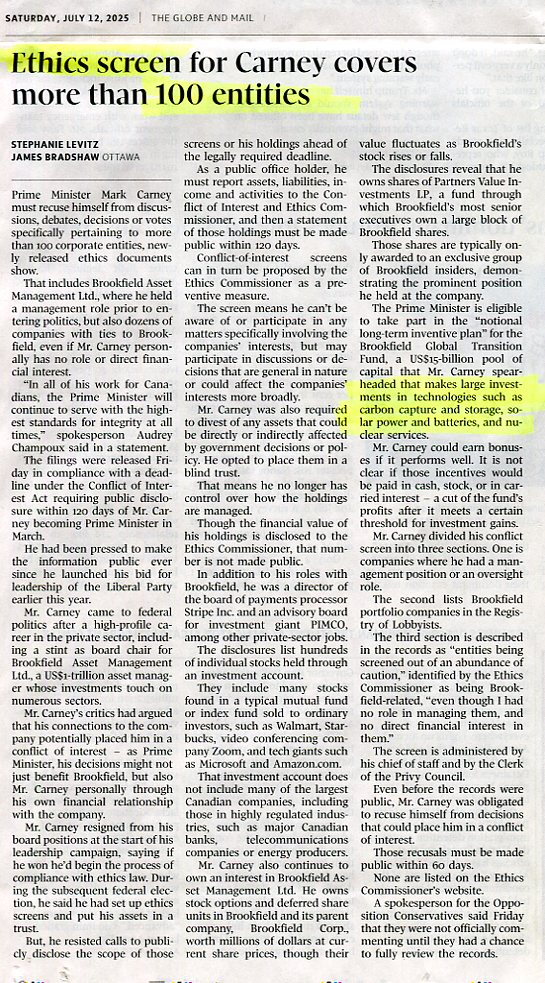 ...Prime Minister Mark Carney will have to recuse himself from any discussions directly involving Brookfield Asset Management, payment processing giant Stripe and dozens of companies owned or controlled by them as part of an extensive conflict-of-interest screen... The screen means that Carney cannot be involved in "any official matters or decision-making processes" that would further either his or the interests of the 103 companies, many of which operate in the renewable energy and real estate sectors... The ethics screen risks posing significant implementation challenges, if only because of the sheer scope of the prime minister's responsibilities combined with the large number of companies to be screened. Adding to the complexity is that Carney has repeatedly promised to transform Canada into a conventional and clean energy "superpower". This is the first time the ethics commissioner will have to police such a broad ethics screen for the highest-ranking elected official whose hand touches nearly all facets of government. That means there will likely need to be a fair amount of self-policing from Carney regarding any potential conflicts in files brought to him... Carney's potential conflicts were a key critique from the opponents after he was elected Liberal leader in early March... The Prime Minister is eligible to take part in the "notional long-term inventive plan" for the Brookfield Global Transition Fund, a US$15-billion pool of capital that Mr Carney spearheaded that makes large investments in technologiles such as carbon capture and storage, solar power and batteries, and nuclear services. Mr Carney could earn bonuses if it performs well...