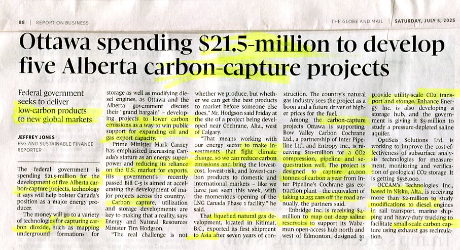 A massive investment in carbon capture technology in Alberta's oil sands, to which Prime Minister Mark Carney has tied his support for new fossil-fuel export [to red China] infrastructure, still faces an uphill battle. The proposed series of emissions-reducing commitments by the Pathways Alliance -- a group that represents the 6 companies that dominate oil-sands production -- has recently gained new life from Carney's focus on fast-tracking nation-building projects, while trying to balance resource-sector growth with sustainability goals... Potential solutions being proposed by carbon-capture advocates, many of them relying on new forms of co-operation between Ottawa and an Alberta government that has run hot and cold on oil-sands emissions reduction, will test both how badly Carney wants what he has controversially called "decarbonized oil", and how adept he is at forging compromise... At the heart of it lies a planned 400-kilometre-long pipeline that would transport carbon captured at oil-sands facilities to an underground hub near Cold Lake, Alberta. The alliance says that would reduce emissions from oil-sands production by 22 megatonnes a year. Roughly a dozen (12) oil-sands facilities spread across the Lower Athabasca Region would participate. Each would capture CO2 onsite, and ship it via pipeline to the main transportation line...