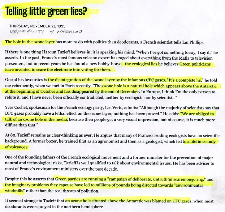 France's most famous volcano expert has found a new hobby-horse -- the ecological lies he believes Green politicians have invented to scare the electorate into voting for them... The disintegration of the ozone layer by the infamous CFC gases "is a complete lie"... The ozone hole is a natural hole which appears above the Antarctic at the beginning of October and has disappeared by the end of December... Green parties are running a campaign of deliberate, untruthful scaremongering and the imaginary problems they espouse have led to millions of pounds being directed towards "environmental windmills" rather than the real threats of pollution... A spokesman for the French ecology party admits: "We are obliged to talk of an ozone hole in the media, because then people get a very visual impression, but of course, it is much more diffuse than that"...