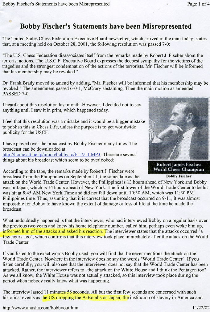 The United States Chess Federation Executive Board newsletter states that, at a meeting held on October 28, 2001, the following resolution was passed 7-0: "The U.S. Chess Federation disassociates itself from the remarks made by Robert J. Fischer about the terrorist actions. The U.S.C.F. Executive Board expresses the deepest sympathy for the victims of the tragedies and the strongest condemnation of the actions of the terrorists. Mr. Fischer will be informed that his membership may be revoked." Dr. Frank Brady moved to amend by adding, "Mr. Fischer will be informed that his membership may be revoked." The amendment passed 6-0-1, McCrary abstaining. Then the main motion as amended PASSED 7-0.I heard about this resolution last month. However, I decided not to say anything until I saw it in print. I feel that this resolution was a mistake and it would be a bigger mistake to publish this in Chess Life, unless the purpose is to get worldwide publicity for the USCF.