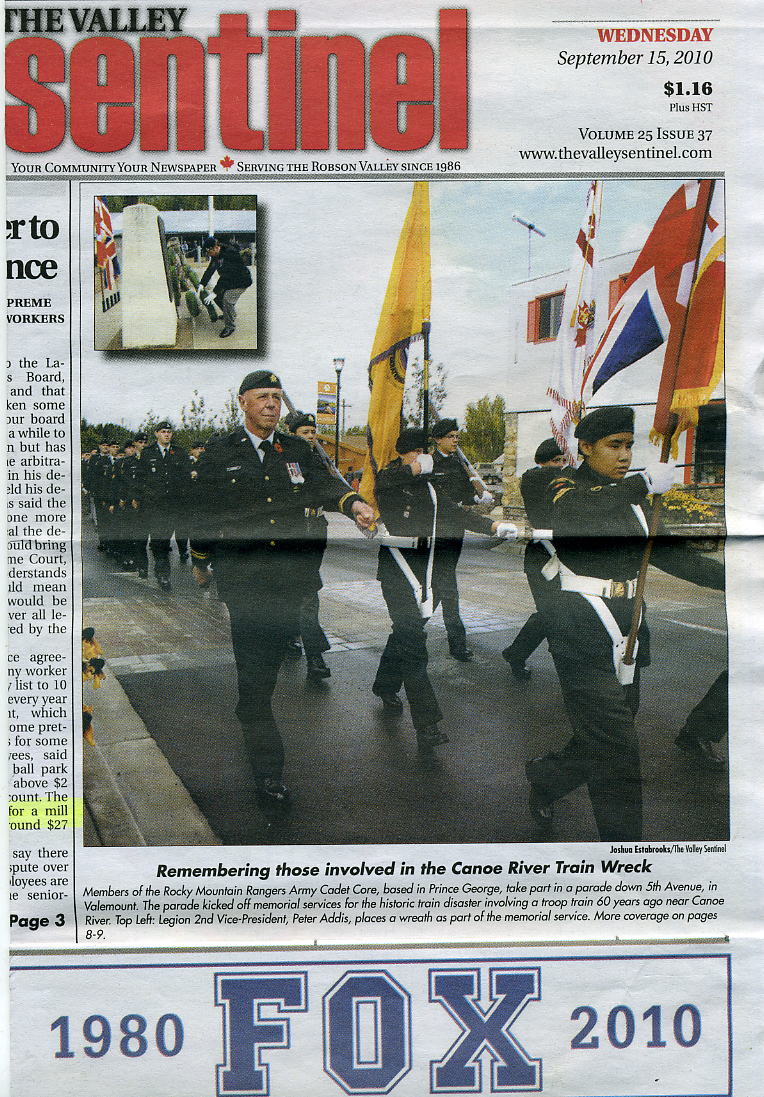 After climbing down Terry Fox Mountain that day, and going back to our rooms to relax and celebrate, I read through the Valemount newspapers and found coverage of the special ceremony commemorating the 1950 train wreck that injured and took the lives of Canadian soldiers on their way to join the Korean War.