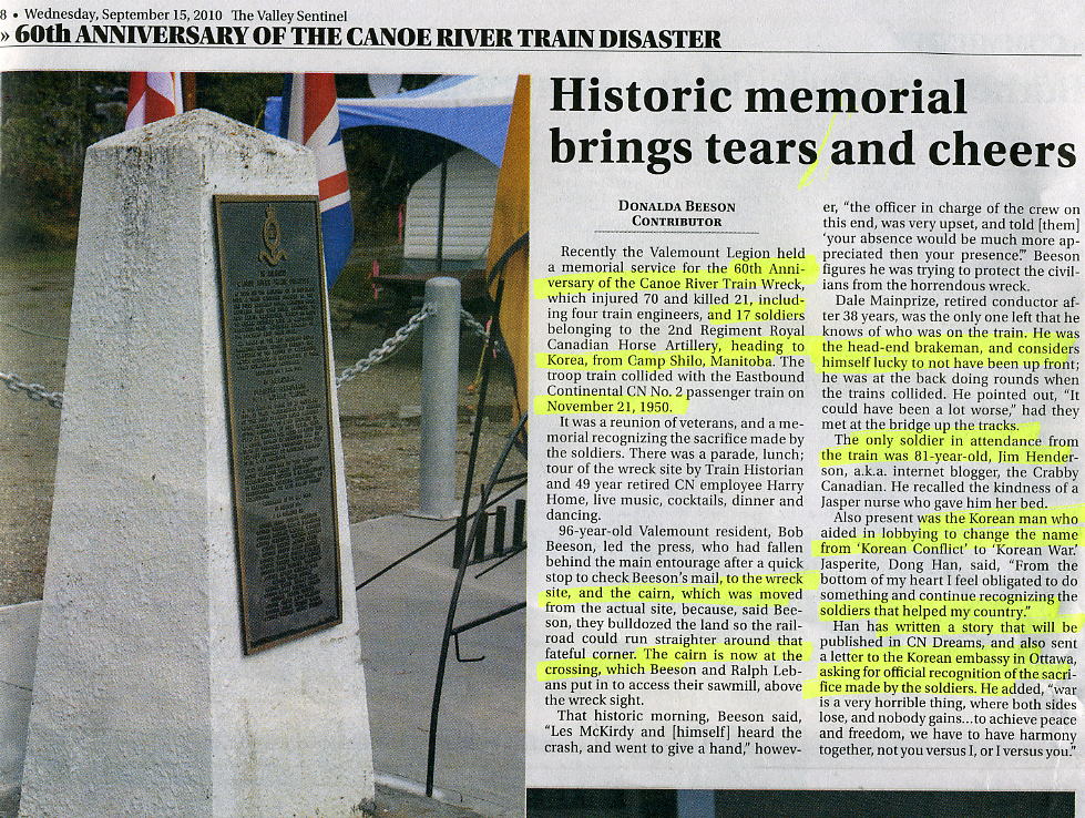 ...96-year-old Valemount resident, Bob Beeson, led the press...to the wreck site, and the cairn, which was moved from the actual site, because, said Beeson, they bulldozed the land so the railroad could run straighter around that fateful corner. The cairn is now at the crossing, which Beeson and Ralph Lebans put in to access their sawmill, above the wreck site... Dale Mainprize, retired conductor after 38 years, was the only one left that he knows of who was on the train. He was the head-end brakeman, and considers himself lucky to not have been up front; he was at the back doing rounds when the trains collided. He pointed out, "It could have been a lot worse," had they met at the bridge up the tracks. The only soldier in attendance from the trains was 81-year-old, Jim Henderson... Also present was the Korean man who aided in lobbying to change the name from "Korean Conflict" to "Korean War". Jasperite, Dong Han, said, "From the bottom of my heart I feel obligated to do something and continue recognizing the soldiers that helped my country. Han has written a story that will be published in CN Dreams, and also sent a letter to the Korean embassy in Ottawa, asking for official recognition of the sacrifice made by the soldiers. He added, "war is a very horrible thing, where both sides lose, and nobody gains... to achieve peace and freedom, we have to have harmony together, not you versus I, or I versus you".