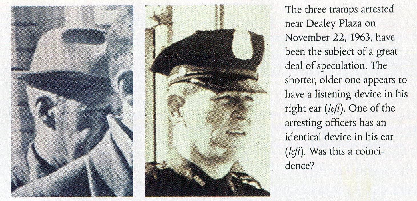 During the pandemonium a train started moving down the tracks, without permission, and Bowers had to signal it to stop. He called the police to search the train and three "transients" were found and escorted to the Sheriff's office. Note that one of the transients (aka tramps) -- the one in the baggy pants - has a hearing-aid in his ear. He could have been on the receiving end of the man Bowers saw talking into the walkie-talkie He could also be the gun-man DEAF-MAN Hoffman described as wearing "railroad" trousers -- the one who had a pistol in his hand -- the one who probably fired the bullet that hit JFK in the front of the throat. This corroborates the story SIGNAL-MAN Holland said about the sound of the two shots coming from behind the picket fence -- the first was quieter than the second (ie a pistol is nowhere near as loud as a high-powered automatic rifle). The other two "tramps" discovered by Bowers were probably assassins too -- firing from the Texas School Book Depository and then escaping out the back of the building and into the train-car where they were found.