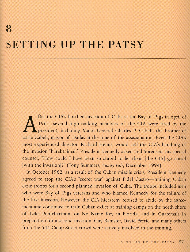 Page 3: SETTING UP THE PATSY.... After the CIA's botched invasion of Cuba at the Bay of Pigs in April of 1961, several high-ranking members of the CIA were fired by the president, including [Director Allan Dulles] and Major-General Charles P Cabell, the brother of Earle Cabell, mayor of Dallas at the time of the assassination....