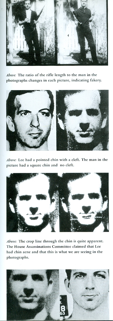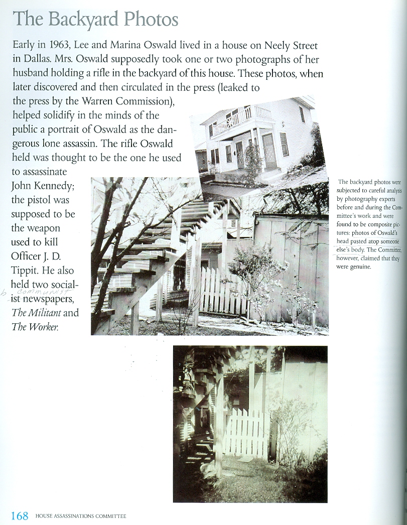 Page 169: THE BACKYARD PHOTOS.... Among the evidence used to indict Oswald and portray his "violent nature" were two photographs (Warren Commission Exhibits 133A and 133B) supposedly showing him with a rifle, a pistol, and two [communist] newspapers. They are the only evidence linking him to the weapons said to have been used in the Kennedy assassination and the killing of J D Tippit. The photographs, reportedly "found" soon after the assassination in Ruth Pain's garage, where Marina Oswald was living with daughters June and Rachel, are obviously fraudulent. (Someone else stood in Oswald's Neely Street backyard and Lee's face was superimposed on the other man's body). There are better than a dozen ways to prove that the photographs do not depict an actual occasion, that Lee could not have posed for them, and that they were manufactured prior to the assassination. In proving that these photos are fake, one proves that Lee Oswald was set up well in advance of the assassination as "the patsy". The most alarming aspect of the backyard photos is that they were created to frame Oswald before the crime was committed and planted among Oswald's possessions before the murder took place....