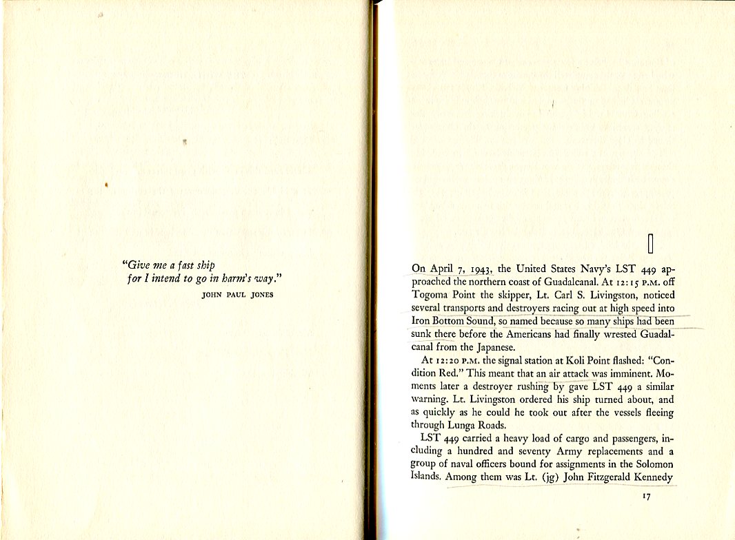 LST-449 carried a heavy load of cargo and passengers, inclduing a hundred and seventy Army replacements and a group of naval officers bound for assignments in the Solomon Islands. Amongt them was Lt John Fitzgerald Kennedy of Boston, a bachelor a few years out of Choate and Harvard, who had recently completed the course at Motor Torpedo Boat Squadron Training Center at Melville, Rhode Island. As a transient he had no duties aboard and was below in his bunk reading when Lt Livingston began ducking from one destroyer screen to another for protection as the ships continued to clear the roads. The sharp turns rolled Lt Kennedy around in bed. He thought it strange, yet no word came from above to arouse concern. It could hardly have dawned on him or his fellow passengers that the Japanese had launched their greatest air attack since Pearl Harbor and that at this moment a hundred and seventy-seven enemy fighters and dive bombers were roaring toward Guadalcanal from Rabaul, New Britain.