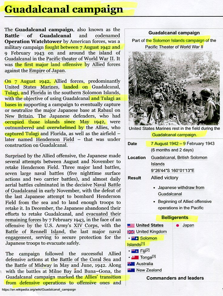 I trust that readers, having now read the history of Tulagi island -- and its important role in the victory of the allies (USA-SOLOMONS-AUS-NZ) over the enemy in WWII -- will now comprehend the threat posed to the Free World by the handing over of Tulagi to Communist China.