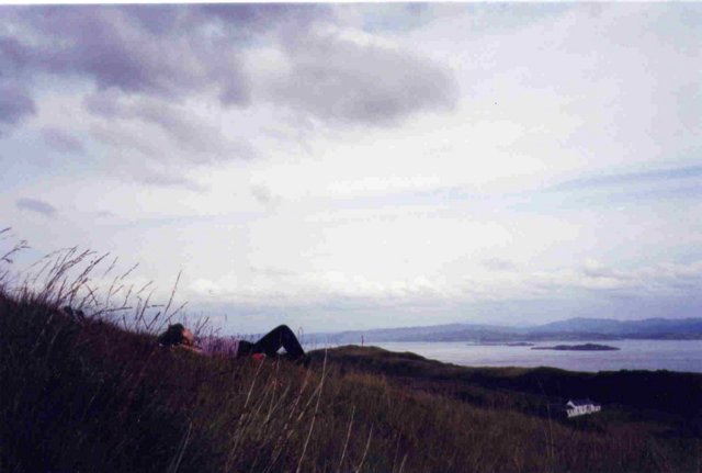 Exhausted after the climb I had a nap on the slope of Orwell's hill, my idea of "Splendour in the Grass". After awakening we took one last photo of Barnhill which was again a small white dot in the landscape but one that I would forever remember full size and up close.