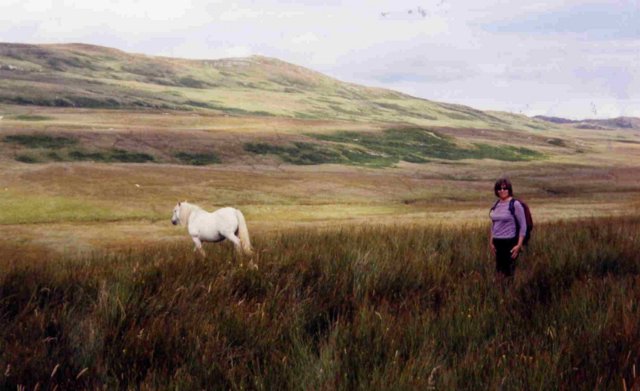 Just beyond the point where the trail to Barnhill begins a solitary white horse was watching us. I went up to try and pat him but he walked away before I reached him. He didn't seem to want his picture taken.