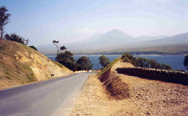 In the first photo above you can see the Paps of Jura immediately behind me. I'm hiding the ferry dock but on my left - a mile along the road to Craighouse - you can see a driveway leading down to a big house. That's a private residence now but it used to be a hotel. Our DRIVER'S GUIDE TO JURA says it was built in the 17th century, by government statue, as an Inn for the highlanders "to protect them from the serious effects of their own hospitality". I stayed on deck for a long time, staring with my binoculars at Jura receding into the mist on our left. The second photo shows the bottom of Jura and its eastern tip as we exit the Islay channel.