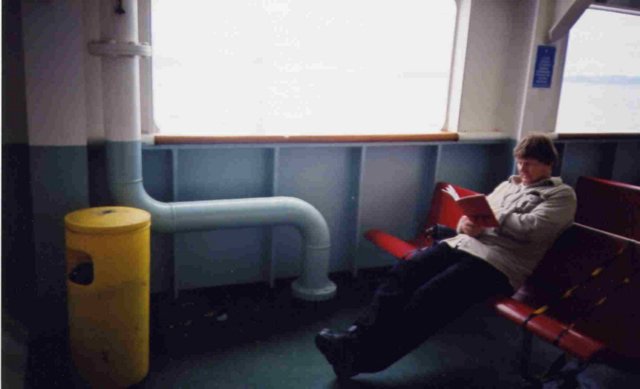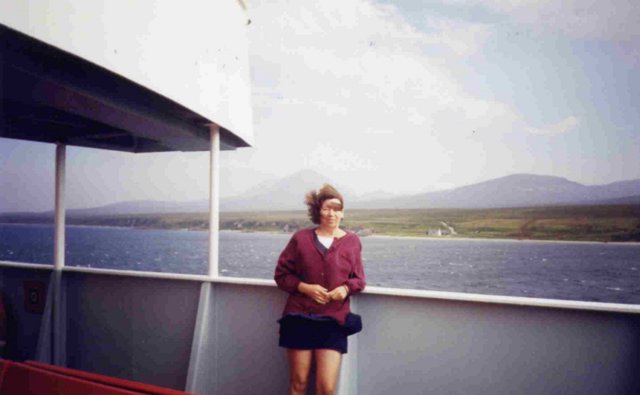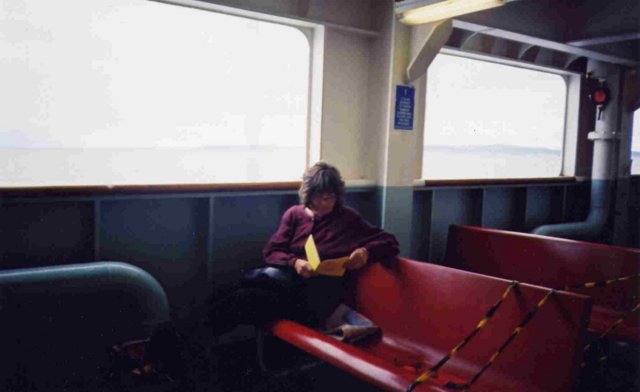 In the magazine shop on the ferry I found four little booklets about Jura and read that the word "jura" is Viking for "deer" and that the deer outnumber the people by a ratio of some 300/1 and there are more than 100 bird species. In the photos below I'm reading JURA AND GEORGE ORWELL by Gordon Wright and my husband is reading THE LONG ROAD, A DRIVER'S GUIDE TO JURA, by Peter Youngson. We were saving the last one, JURA, A GUIDE FOR WALKERS by Gordon Wright for when we got to the hotel room. The land mass barely visible in the upper right is the mainland of Scotland receding in the distance.