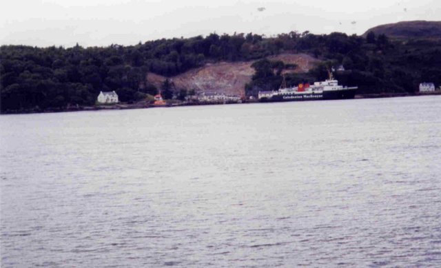 Those mountains in the distance are the Paps of Jura and that's Port Askaig down below. Notice the little Jura ferry pulled up at the dock waiting for the cars to come off the big ferry which is obscured behind the trees.