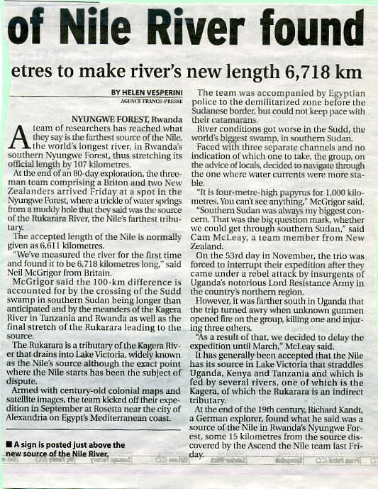 Team reaches Nile's true source (many rivers feed Lake Victoria). BBC, Apr 1, 2006