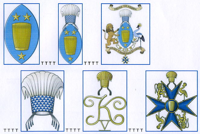 New Royal Project (On behalf of His Majesty King Jean-Baptiste Kigeli V Ndahindurwa of Rwanda we were approached by persons in his service with a request to produce a set of heraldic insignia for His Majesty...His Majesty's Coat of Arms design is based on a number of symbols representing the various attributes of the monarchy. The crest is comprised of a traditional royal head-dress or crown, a symbol representing the monarchy. HM wears a traditional crown in a photo found on the page describing the monarchy. The three stars, positioned top right and left, and one below the arms symbolize the three clans of Rwandans: Hutu, Tutsi & Twa. The lion figures prominently in the history and monarchy of Rwanda, symbolizes the power of the monarchy. The crest-crane symbolizes the nobility of the monarchy. The central figure is the Royal Drum. It is a very important symbol which equates to the combined value of the Sword of State and the Scepter and Orb of a British coronation ceremony.
